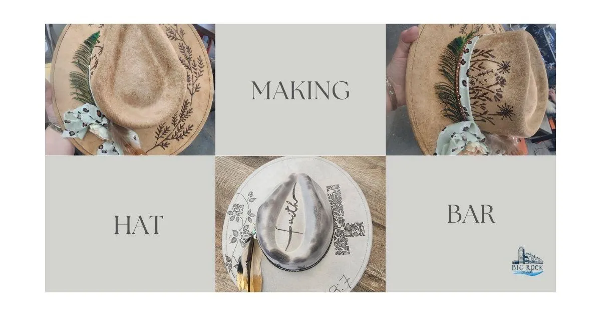 This added class includes: 2 trim, 2 accessories, more add-ons available to purchase during class, and all the designs you want to do on your hat. Different materials, stencils, accessories, wood burning tools, mini hand torches, glue, and paints will be provided for use, to build some wearable art!!